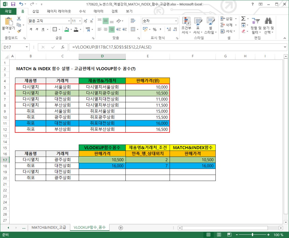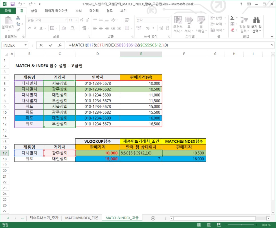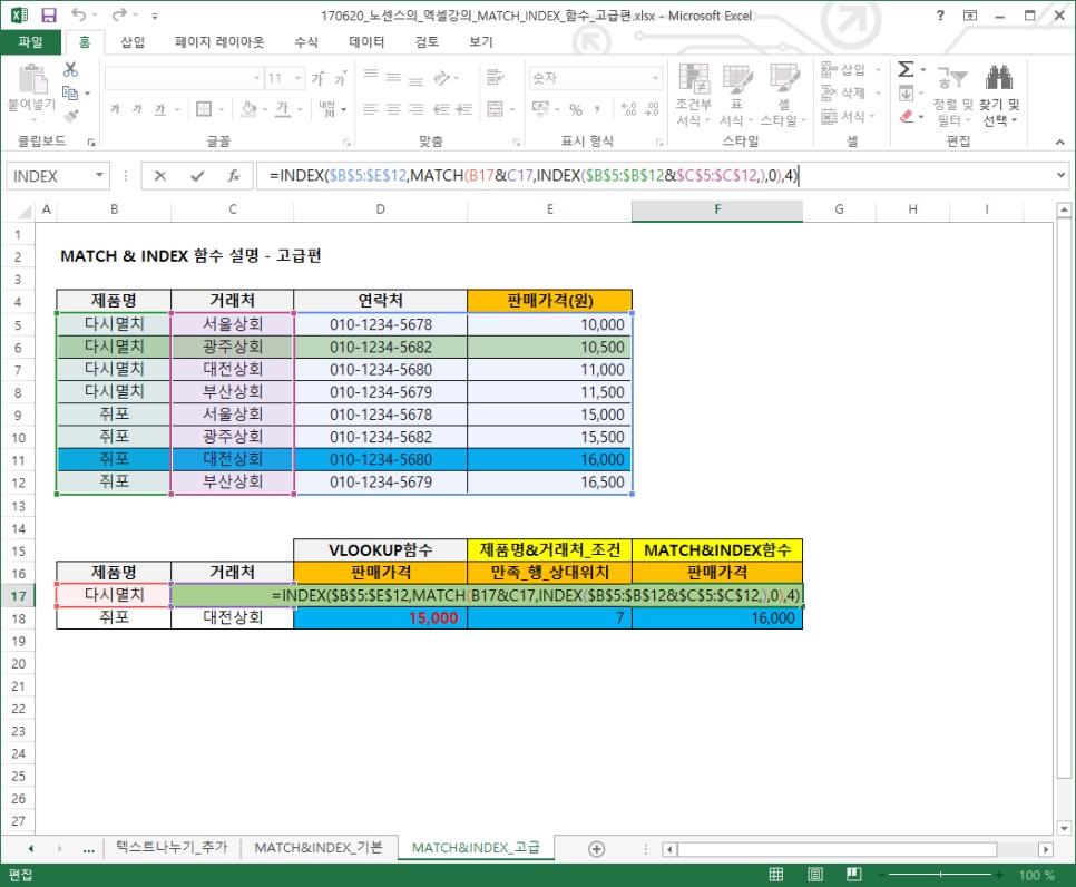 제품명과 거래처 2가지 조건을 만족하는 행의 상대위치가 나왔으니 INDEX 함수를 이용해 판매가격을 찾으면 됩니다. F17셀에 입력된 수식은 다음과 같습니다.