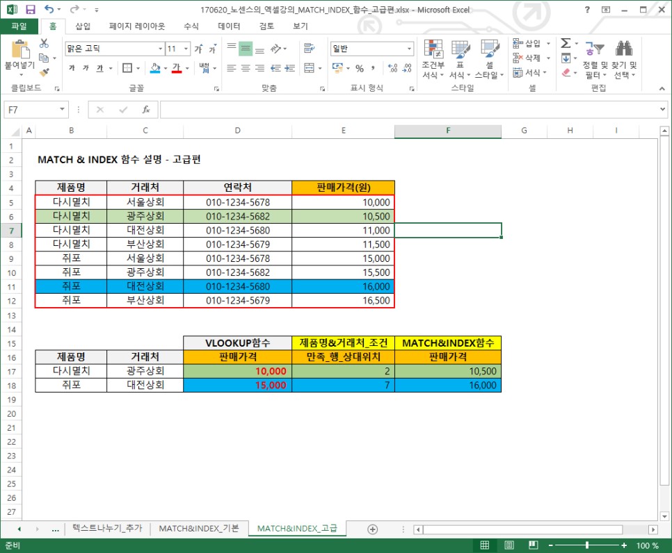 어떠세요? 이해가 좀 되시나요? 이렇게 INDEX와 MATCH 함수를 응용하면 VLOOKUP 함수와 달리 여러가지 조건을 만족하는 값을 찾는 일도 가능합니다. 보기만 해선 어려우는 반드시 강의자료를 다운 받으셔서 직접해보시기 바랍니다.