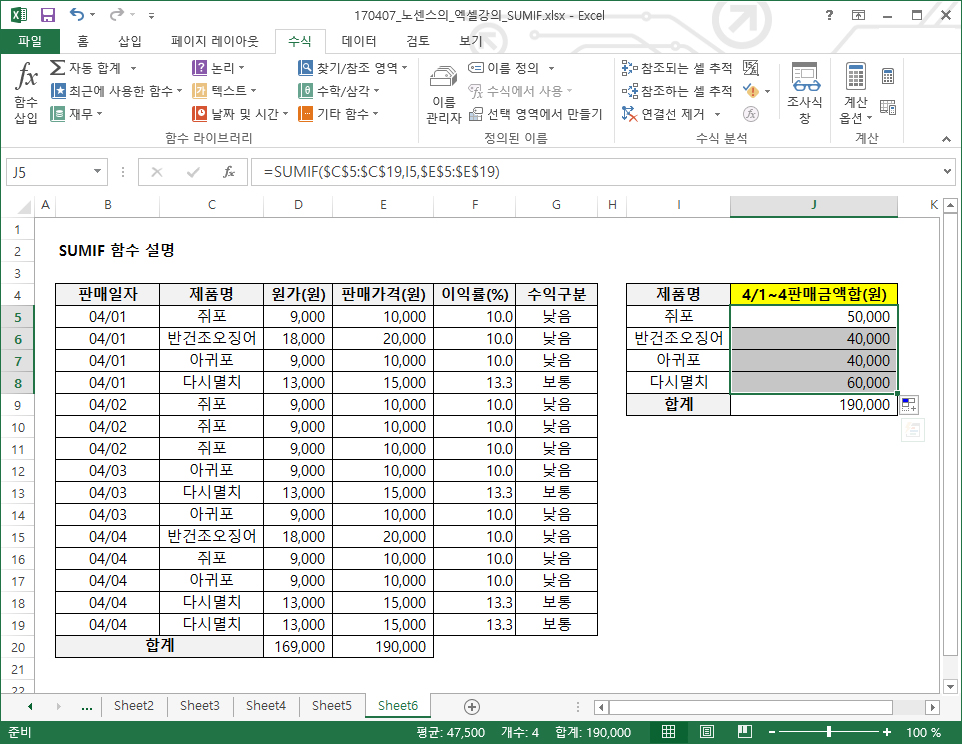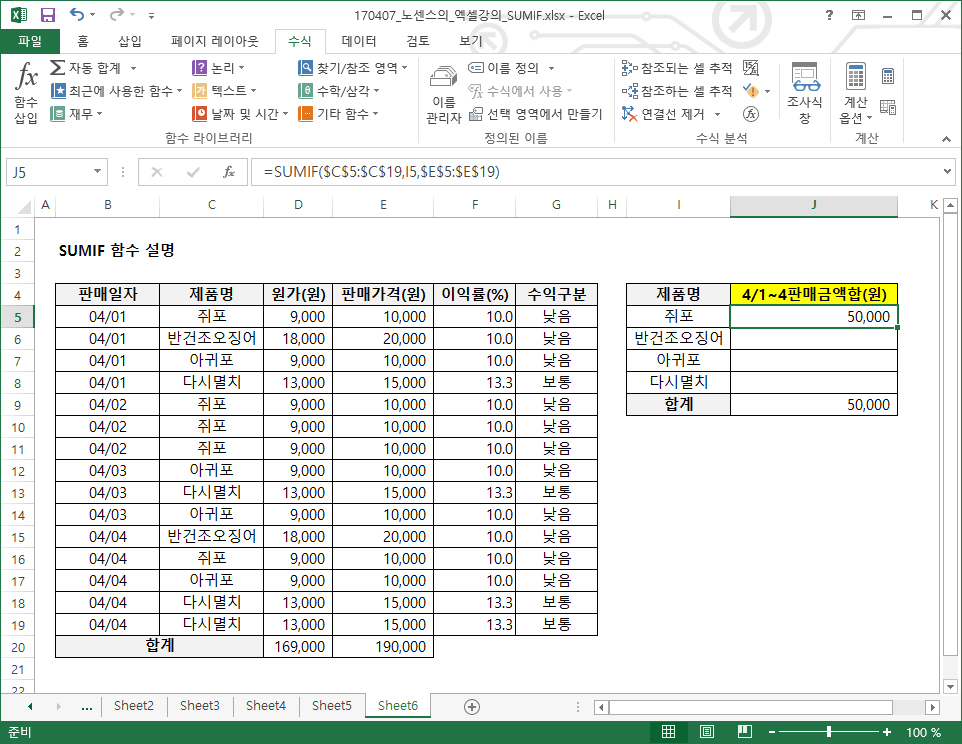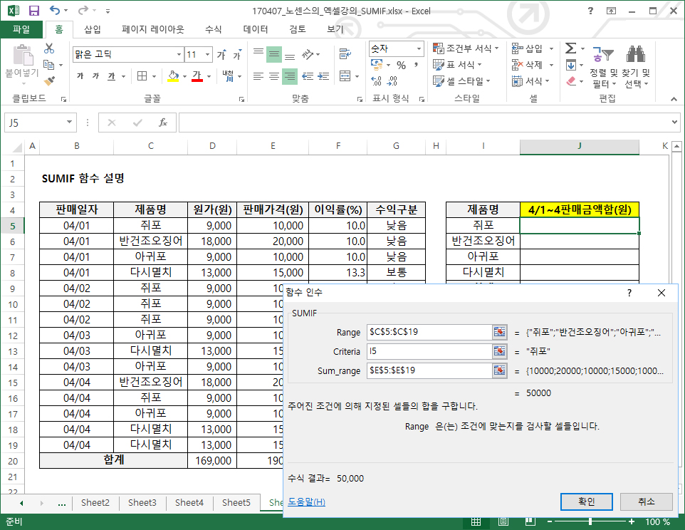 이렇게 함수를 입력하면 아래와 같은 결과가 나옵니다. 4/1~4까지 쥐포는 총 5개가 팔렸고, 그 합은 50,000원입니다. 맞게 결과가 출력되었습니다.
