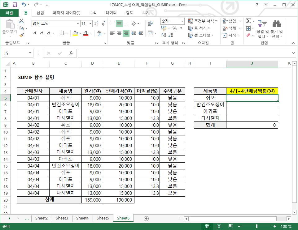 SUMIF 함수는 특정 항목에 연관된 값만 합계를 구해주는 함수입니다.
