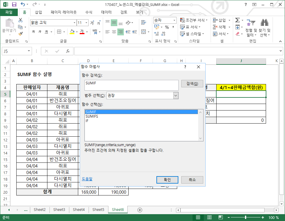 언제나처럼 수식에서 함수삽입을 하고, SUMIF를 검색하고 확인을 눌러주세요.