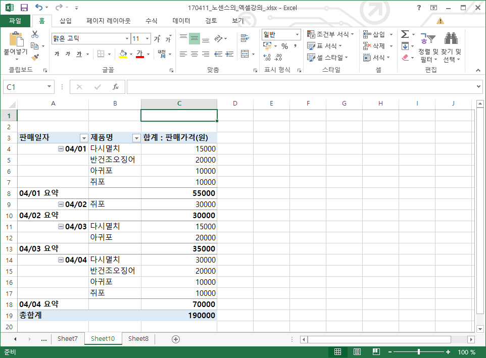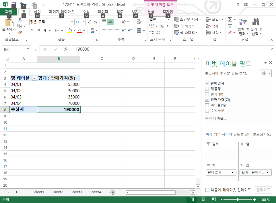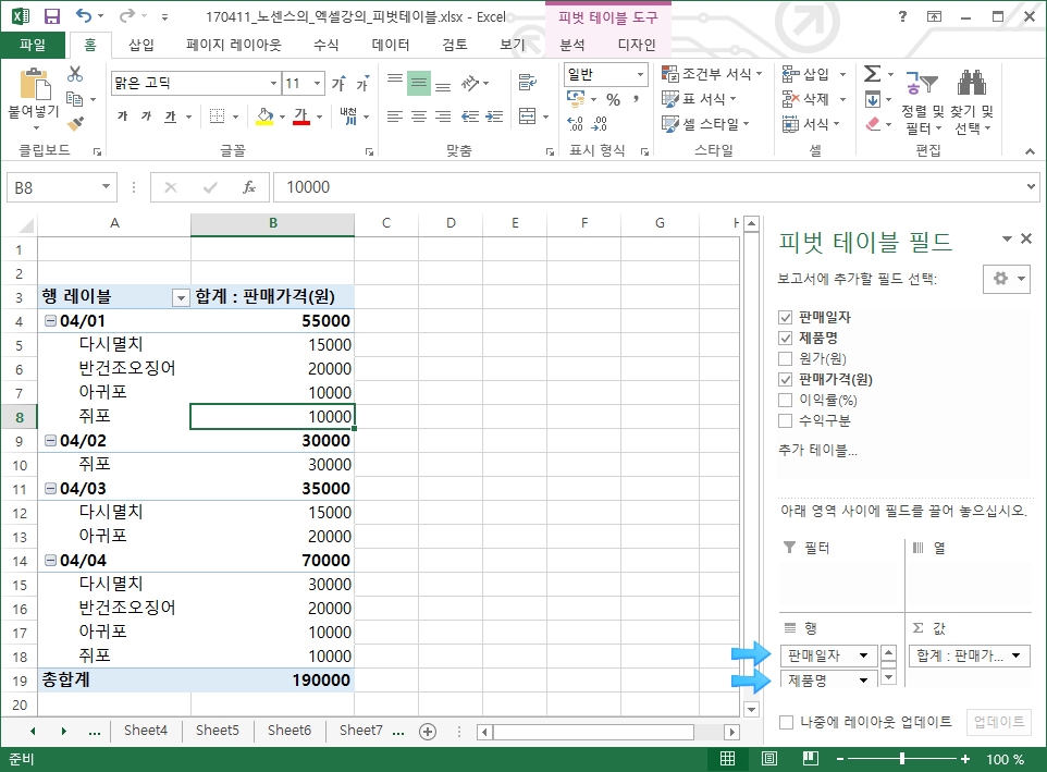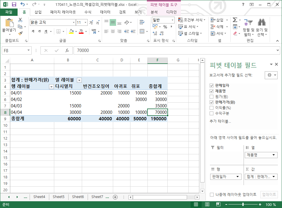 이렇게 보는 방법도 있지만, 『판매일자』는 『행』에 그대로 두고, 『제품명』은 『열』에 두면 아래와 같이 표시됩니다. 보기 편하게 행과 열에 어떤 항목을 둘지 정하시면 됩니다.