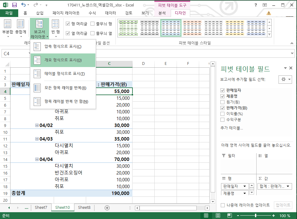 『개요 형식으로 표시』는 아래와 같습니다. 상위 항목의 합계가 위에 표시되구요.
