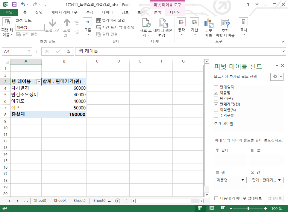 이제 제품별 판매금액의 합을 보도록 해보겠습니다. 이전과 동일하게 『판매가격』은 『값』 부분에 위치시키고, 이젠 『행』에 『판매일자』 대신 『제품명』을 넣으면 됩니다. 그러면 아래와 같이 제품별로 판매금액의 합을 볼 수 있습니다.