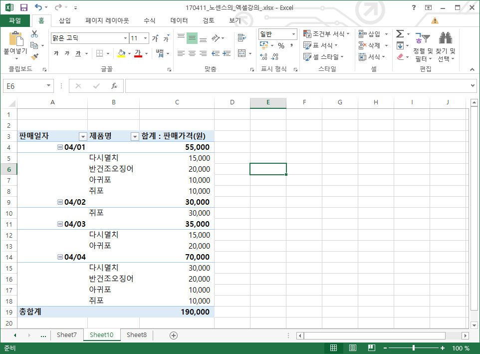 다음 시간에는 합계가 아니라 개수라든지, 평균 등 다양한 계산을 실시할 수 있는 방법에 대해서 추가 설명드리도록 하겠습니다.