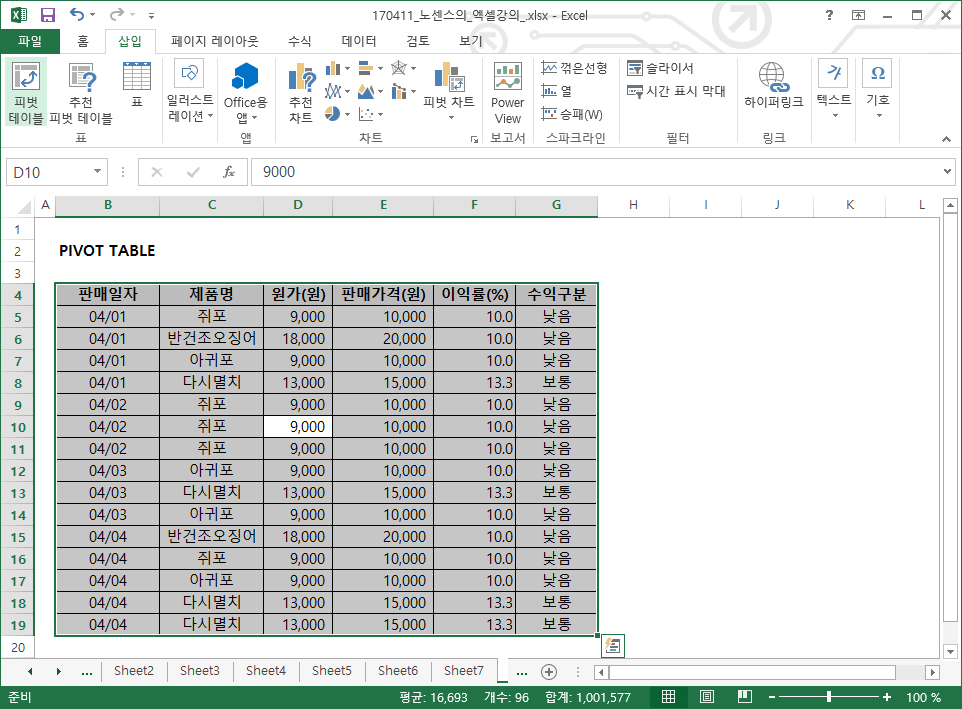 피벗테이블이 어떤건지 이제 감이 좀 잡히셨나요? 아무래도 직접 해봐야 알 수 있기 때문에 제가 자료를 첨부하여 놓겠습니다.