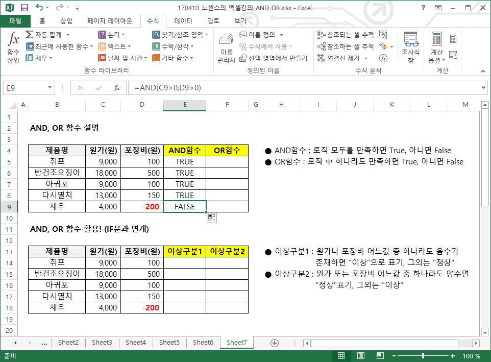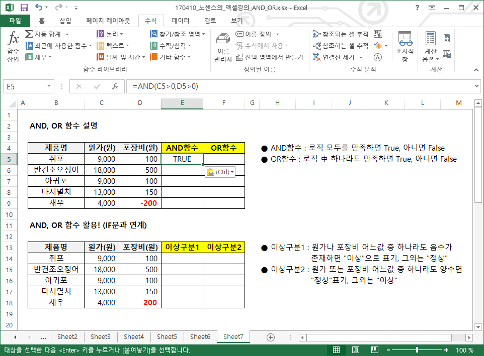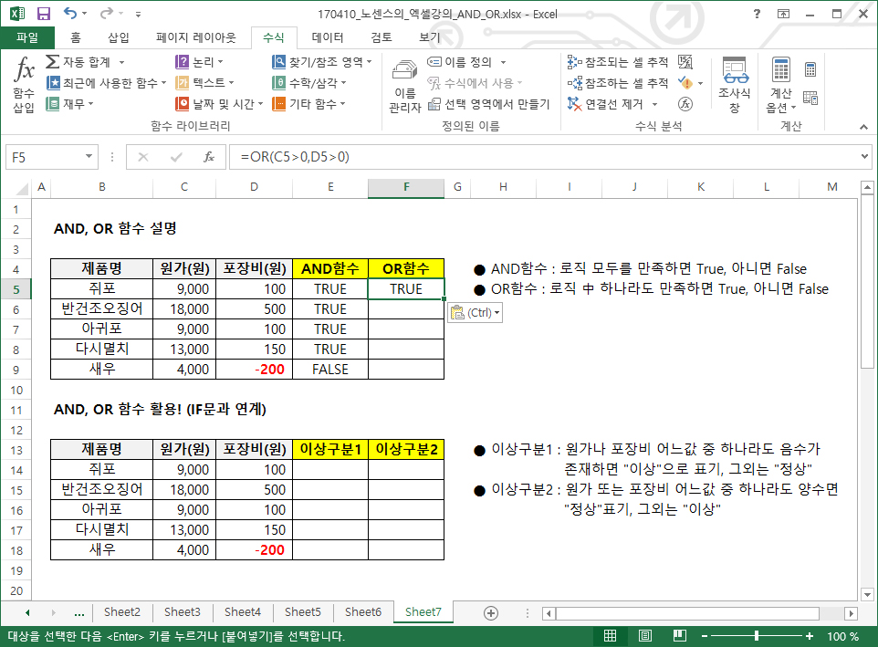 새우의 경우 원가가 양수이기 때문에 포장비가 음수라도 OR함수는 "정상"을 출력합니다.