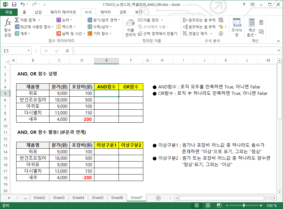 이 수식을 E18까지 드래그하면, E18의 결과값이 "이상"으로 출력됨을 알 수 있습니다. 바로 새우의 포장비가 음수이기 때문이지요.