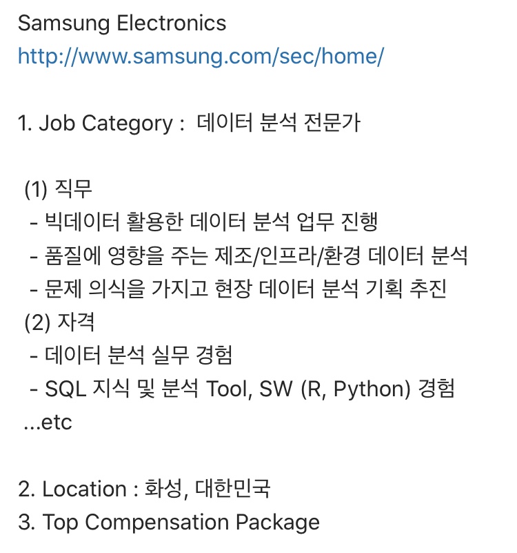 삼성전자의 경우 linkedin에서 검색해보면 데이터 분석 분야 해외 채용공고를 볼 수 있으나 국내 직무기술서는 찾기가 어려워