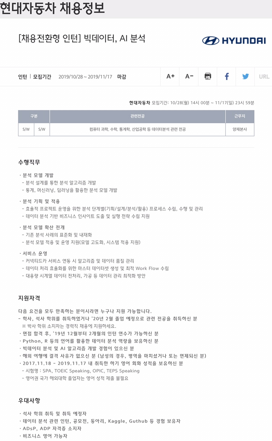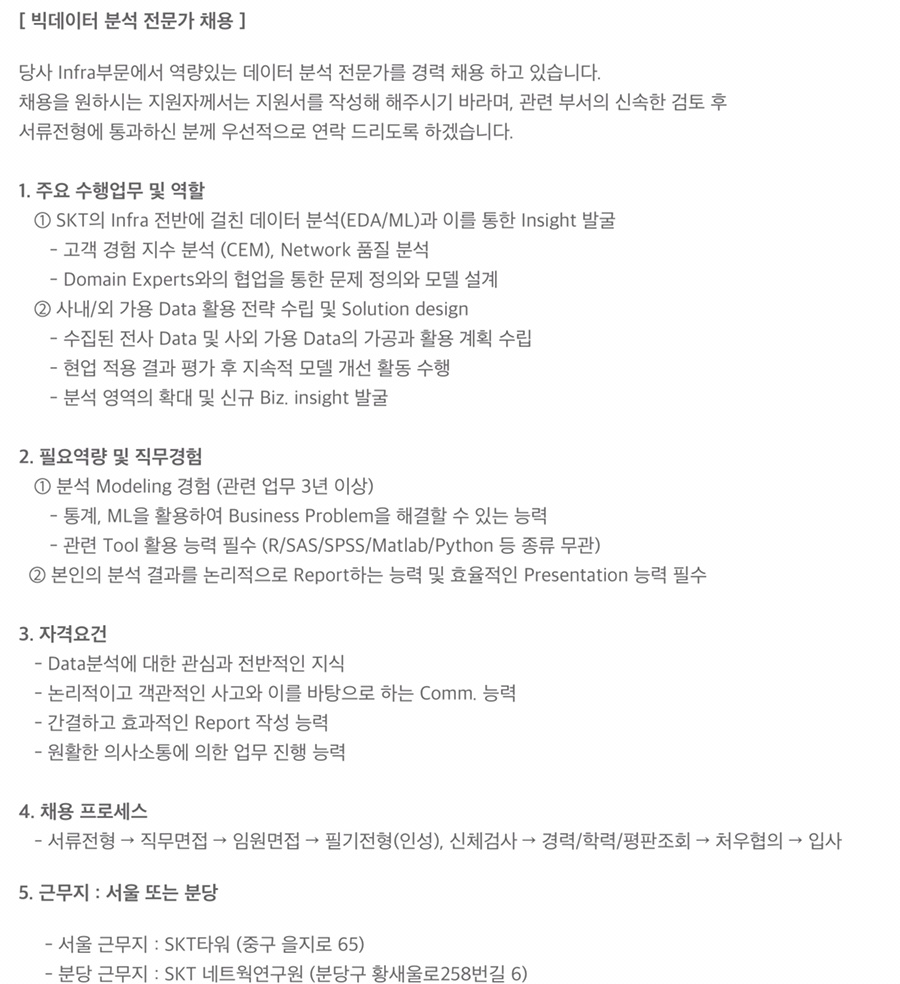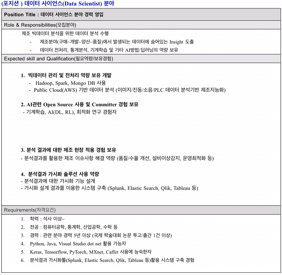 먼저 우리나라 대표 대기업의 데이터 분석 분야 채용 직무기술서(job description)에 대해서 알아보겠습니다.