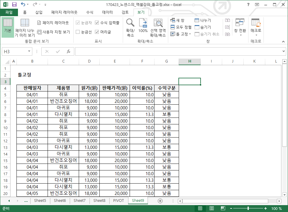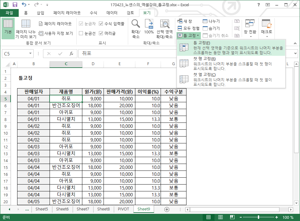 기준이 되는 행, 열값을 고정시킨채로 다른 Data를 보기 편하게 하기 위함이죠.
