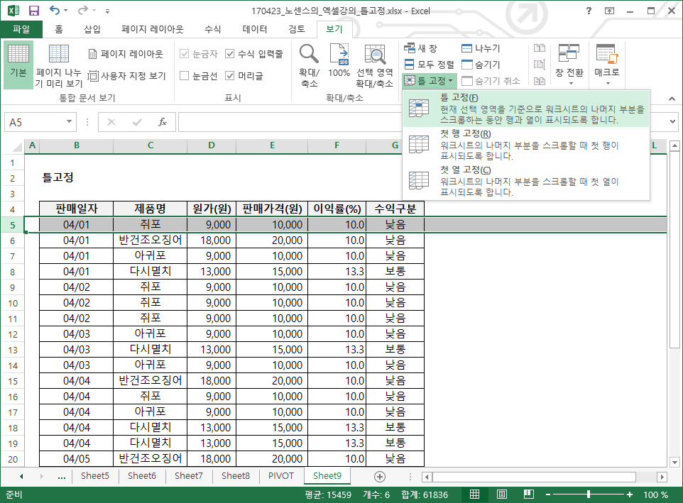 여기선 4행에 '판매일자', '제품명' 등과 같이 항목이름이 있기 때문이기 4행 이상을 틀고정 시킬 예정입니다. 그러면 커서를 아래와 같이 5행에 위치시키시고 『틀 고정』을 실시합니다.