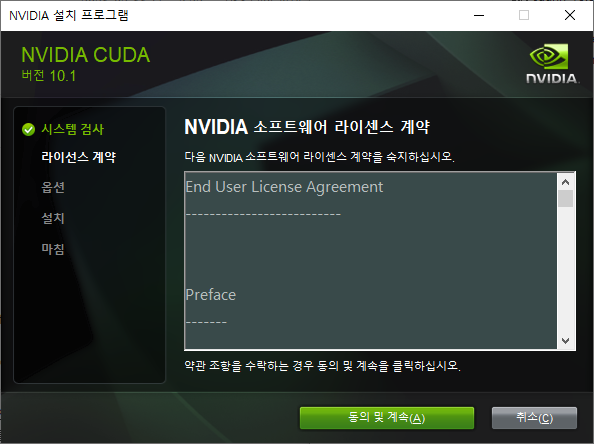 링크로 이동하면 위와 같이 Operating System, Architecture, Version 등을 선택해야 합니다. 본인의 PC 사양에 맞는 걸 선택하시고, Installer Type 같은 경우는 exe(network)는 실행 파일이 작지만 인터넷이 연결된 환경에서만 설치가 가능한 파일이며 exe(local)은 용량이 큰 대신 오프라인 환경에서도 설치가 가능한 파일입니다. 저는 exe(local) 파일을 선택해 다운로드 받았습니다. 다운로드가 완료되면 exe파일(cuda_10.1.105_418.96_win10.exe)을 실행해 설치하면 됩니다.