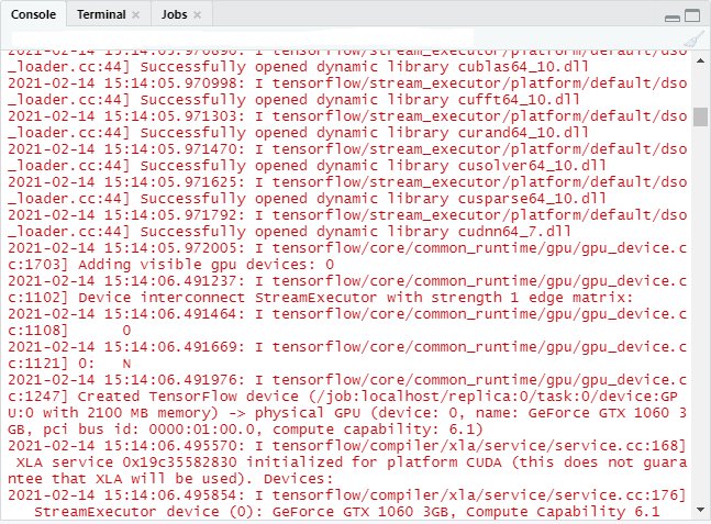 그리고 R에서 keras, tensorflow를 이용해 모델을 구축하고, 실행하면 아래와 같이 에러없이 successfully opened dynamic library라는 메시지가 발생하며 마지막에 device에 관한 정보도 정상적으로 출력됩니다.