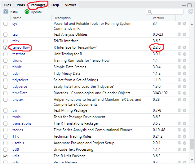 그리고 RStudio를 사용하고 있다면 우측 하단에 위치한 Packages 탭을 확인하면 tensorflow 버전을 확인할 수 있습니다.