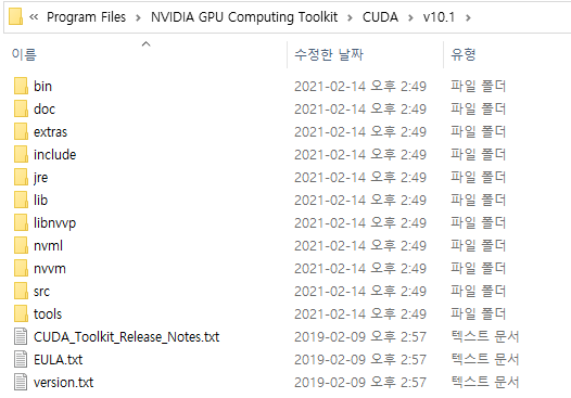 그러면 해당 파일(cudnn-10.1-windows10-x64-v7.6.5.32.zip)을 압축 해제해 이미 설치한 CUDA Toolkit 설치 폴더(C:\Program Files\NVIDIA GPU Computing Toolkit\CUDA\v10.1)에 덮어씌웁니다.